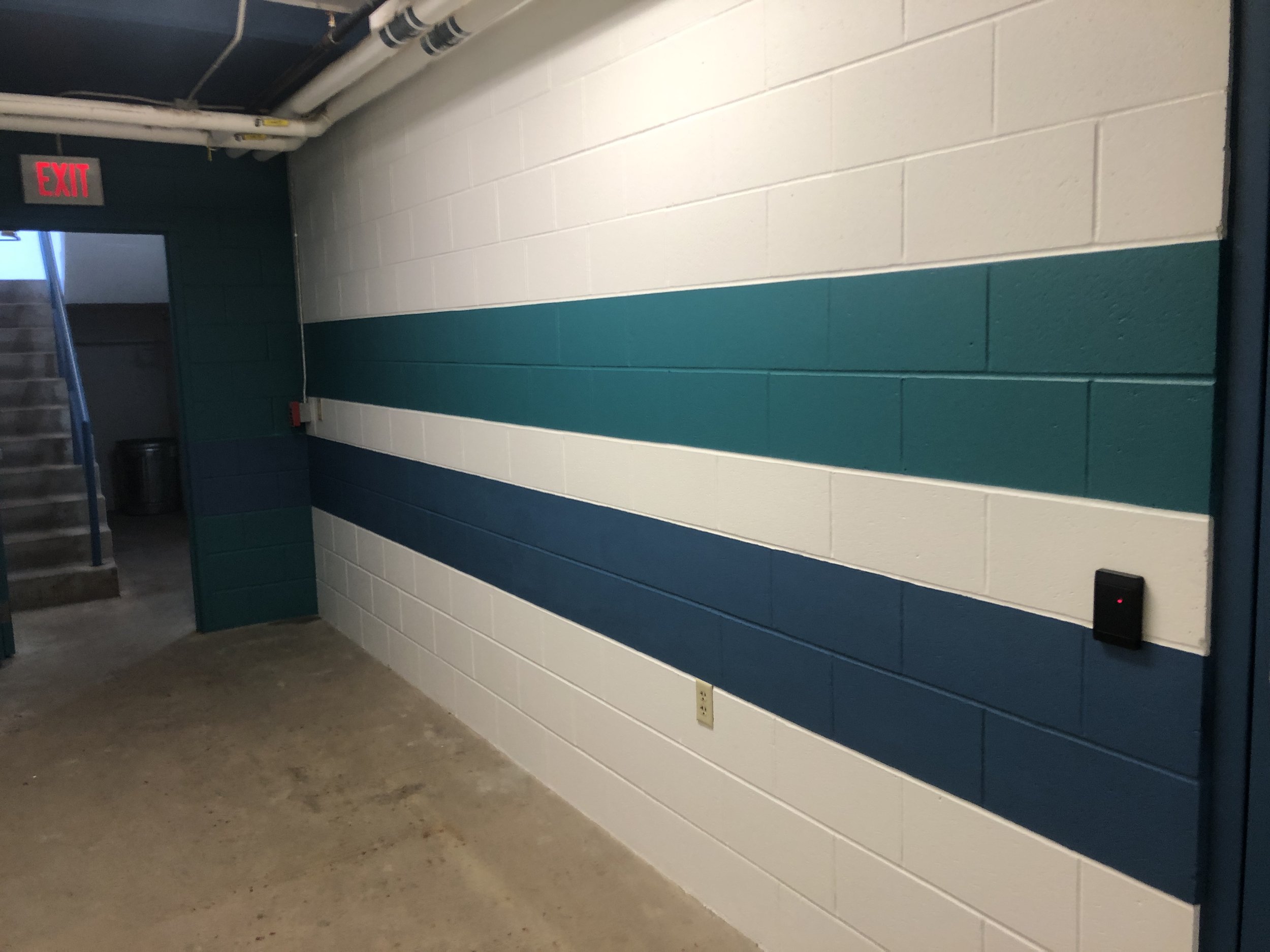 In summer 2022, Howe Heating & Plumbing invited me to design a mural for their classroom space in the basement of their headquarters. Instead, I proposed a full redesign of the classroom along with the adjoining hallway and staircase. Once dark and uninviting, the space was transformed with brighter colors, subtle wayfinding, and a contemporary feel—creating an environment that better reflects a modern college classroom for the young men and women training in their trade.